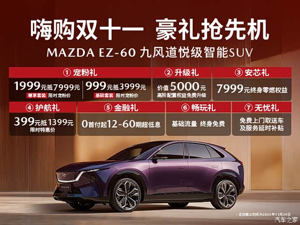 即日起至2025年11月30日,下订购买长安马自达EZ-60车型,还可享七大购车权益!