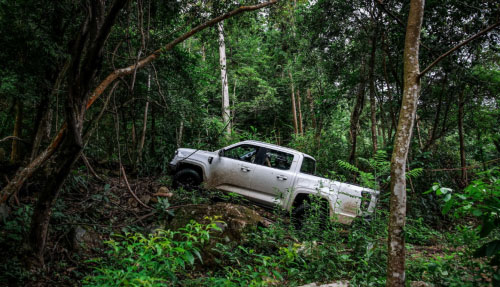 大东山山峦深秀,主要由中生代燕山期花岗岩侵入的穹隆体构成,坡度多在25°以上,山体高峻,沟壑陡峭,极具挑战性。面对陡峭的山峰,大道敢探者历经各种高强度测试打造出来的越级底盘,彰显出了领先同级的绝对实力,其行业首创滚压成型的方钢纵梁,做到了行业第一的183毫米横截面厚度,铸就了钢筋铁骨;搭载皮卡行业首创的多连杆+瓦特连杆后悬黄金组合,多连杆能够提升舒适性,瓦特连杆则能有效降低90%的颠簸感受,行驶在沟壑满布的岩石路也可如履平地;再加上行业最长的220毫米底盘悬挂行程,敢探者能够轻松逾越炮弹坑、碎石堆等各种障碍,将崎岖变为坦途。同时,在挑战途中,车友面对原始森林未知路况难免紧张,大道敢探者依托540°全景影像和透明底盘实现了全车上下无死角预判,让车友每一步都安全感满满,大胆向前走。