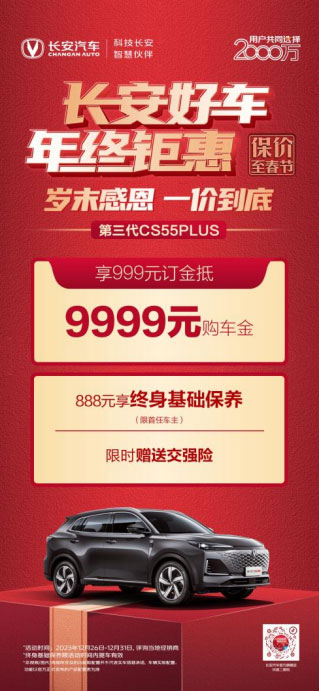 时至年底,长安第三代CS55PLUS还为用户带来年终钜惠,购买第三代CS55PLUS即可享受“999元订金抵9999元购车金”、“888元享终身基础保养(限首任车主)”等一系列购车福利,优惠补贴后起售价仅9.09万元。同时,长安汽车还限时赠送交强险,让用户不仅能轻松拥有,更能无忧用车。
