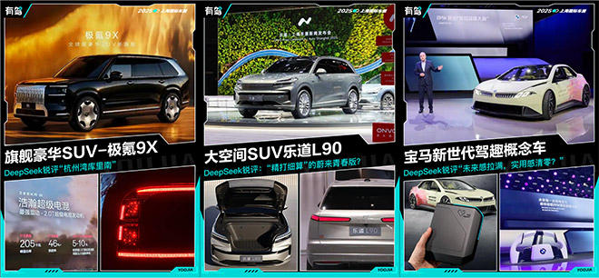 值得一提的是,百度有驾于上海车展,重磅推出全新栏目《DeepSeek车展吐槽大会》,融合趣味性+专业性,通过AI评车 vs 老司机解读的方式,助力用户了解新车核心看点,真正实现 "轻松看展,深度懂车" 的全新体验。