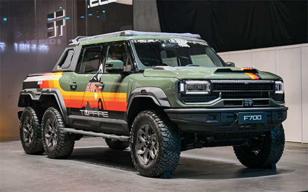 F700、F700 6×6、F700草原牧狼三款车型悉数亮相。F700是高端皮卡领域的全能豪华新物种,以全场景价值重新定义中国高端皮卡新范式,即将携手G700出征2026年环塔拉力赛;F700 6×6是纵横与顶火二次深度合作共创的官方定制车型,以“硬核重塑、极致掌控、奢野美学”全维度进阶,共同打造出厂即巅峰的越野理念与顶火文化信仰的机器猛兽;F700草原牧狼则是针对全地形穿越能力硬核改装升级而来,硬核越野+全能旅居,一车解锁全地形户外生活。